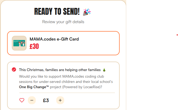 This December, when you buy any gift card through UGiftMe from a MamaCodes class to your favourite high street brand and local brand, you can round up your purchase by just £1, £3, or £5. That small addition goes directly to local schools through LocaeRise’s One Big Change platform.